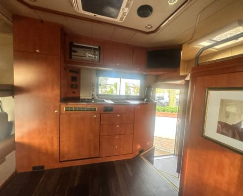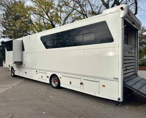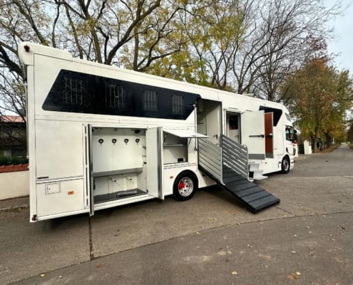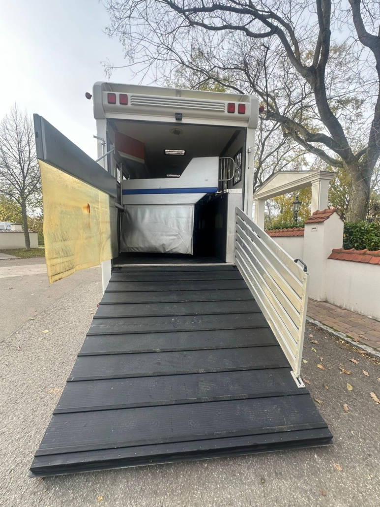 | Description | Diesel Automatic 5 registered seats Bluetooth hands-free kit USB connection Outdoor temperature display 2 trailer couplings Rear view camera Popout Air conditioner Euro 3 green environmental badge Center armrests Radio power windows Breakthrough Topsleeper 6 berths Sitting area TV Sink Hob Microwave Refrigerator Bed over the shower Storage cabinets separate nursing apartment Heating Shower Washbasin WC 6 horses Rear and side ramp Ramp limiter Roof hatches Horse compartment window Security camera in horse compartment external tack room Saddle and bridle holder Horse shower Motorhome registration permissible total weight 18,000 kg FOR US, THE CONDITION AND THE FEEL OF THE BUILDING ARE DECISIVE, THE PRICE TAKES SECOND PLACE. |