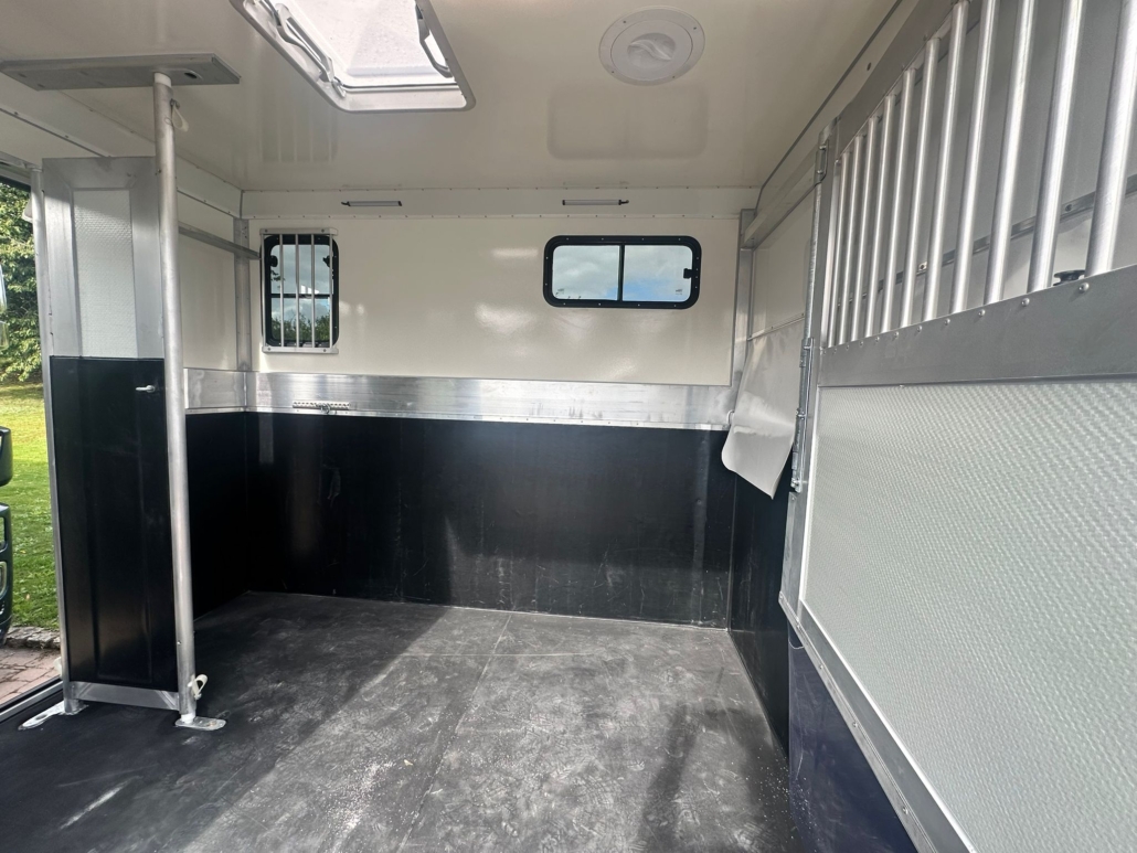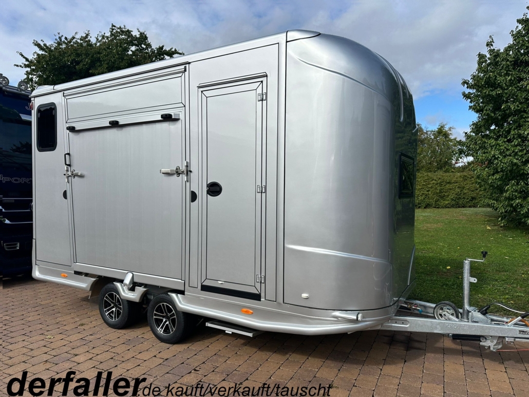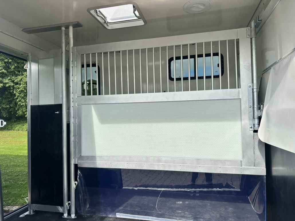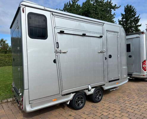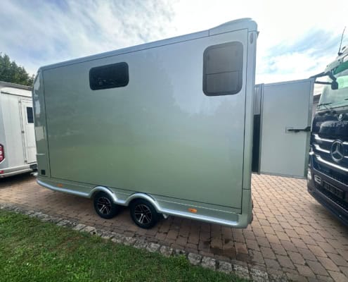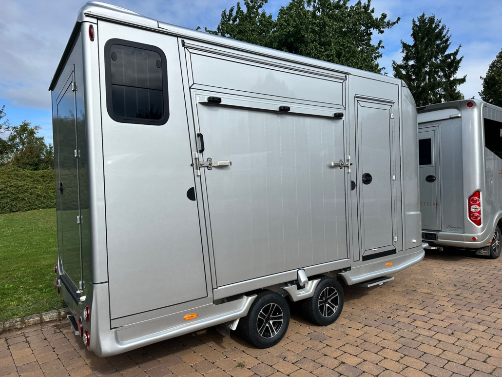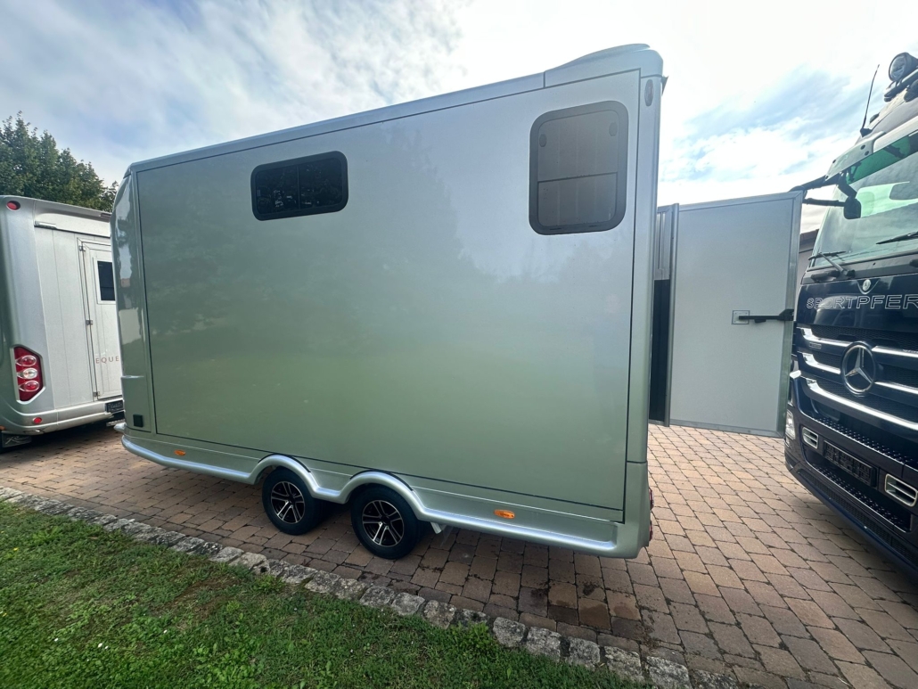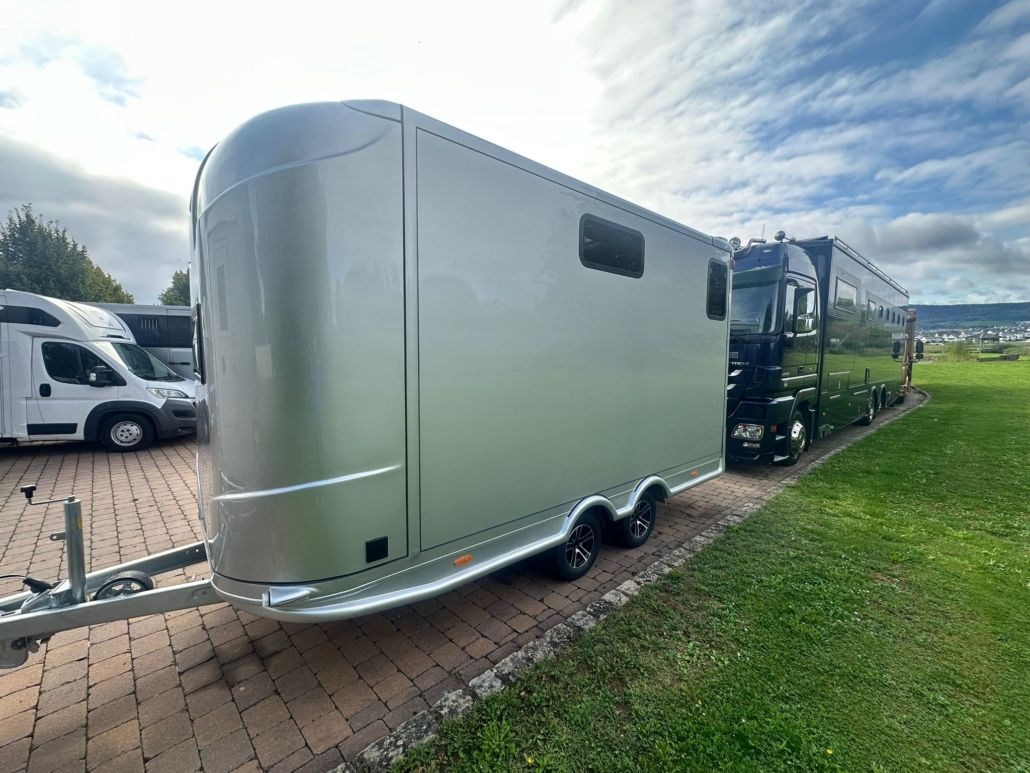 Description | 2 horses Apartment Window in living compartment separate door into the living compartment Sink Microwave Refrigerator with freezer compartment Storage cabinets Sitting area Table Bed 2 berths Shower Boiler Electrical connection Horse compartment window Roof hatch Side ramp Stallion separation large door in the back Rear step Alloy wheels Permissible total weight 2,000 kg to 3,500 kg possible Color ”Metallic” possible for an extra charge of 1.000,00 € net. |