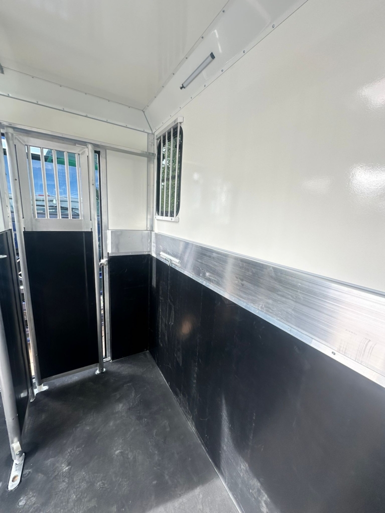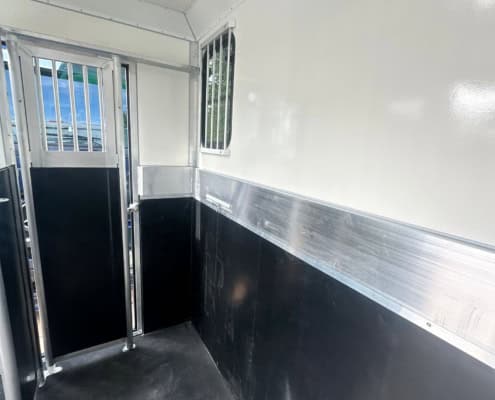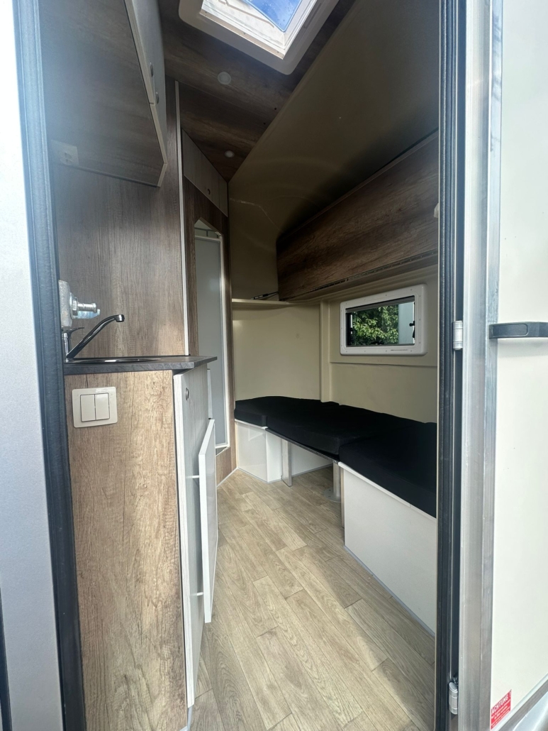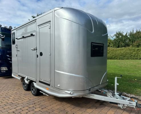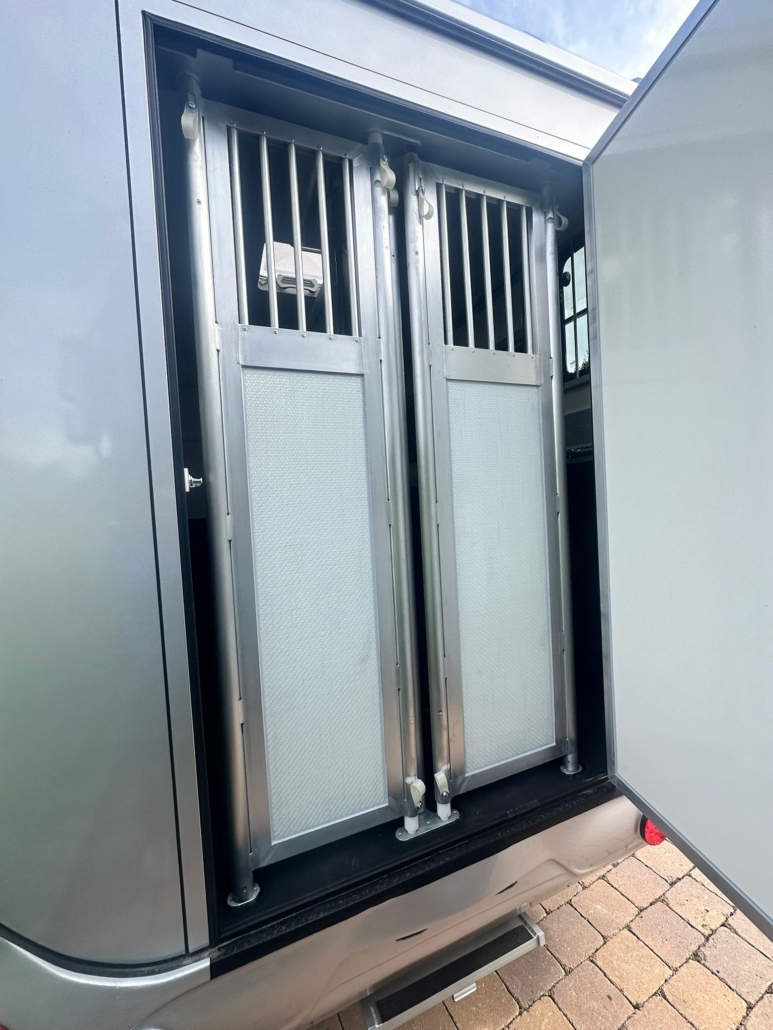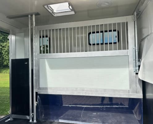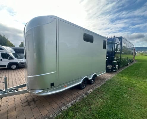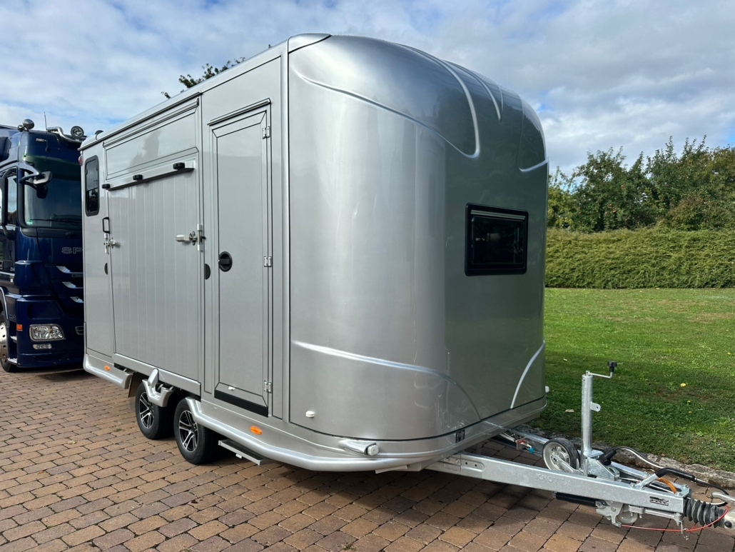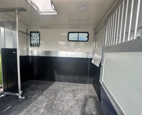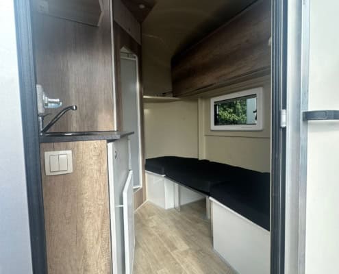 Description | 2 horses Apartment Window in living compartment separate door into the living compartment Sink Microwave Refrigerator with freezer compartment Storage cabinets Sitting area Table Bed 2 berths Shower Boiler Electrical connection Horse compartment window Roof hatch Side ramp Stallion separation large door in the back Rear step Alloy wheels Permissible total weight 2,000 kg to 3,500 kg possible Color ”Metallic” possible for an extra charge of 1.000,00 € net. |