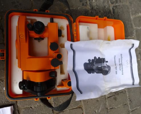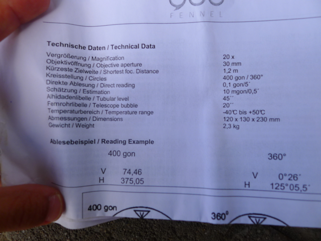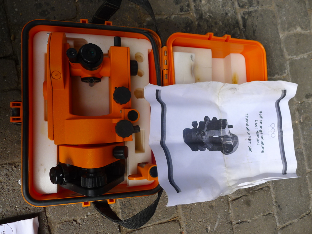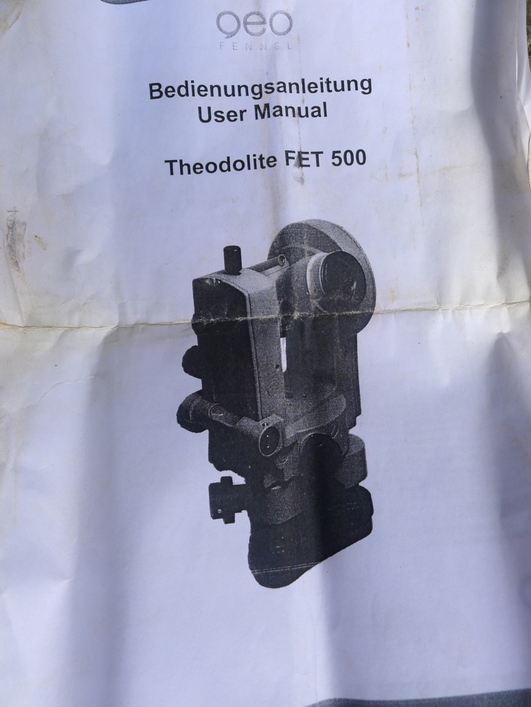 Description | Geo Fennel Theodolite FET 500 rotating laser (without tripod) used Case Adjustment tool Telescope magnification 20x Lens diameter 30mm Shortest target range: 1.20 m Weight: 2.3 kg Temperature range: -40°C to +50°C For further details, please contact Mr. Faller on 0171 2413464. |