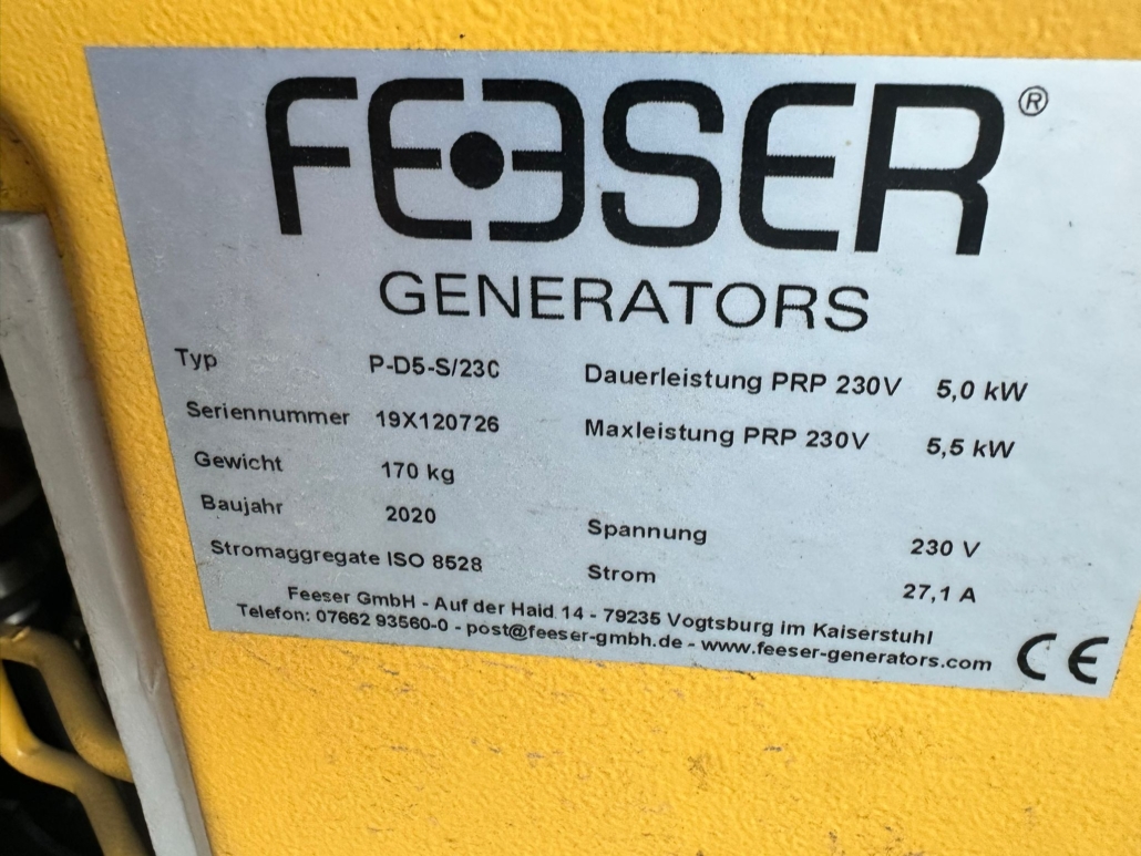 | Beschreibung | Feeser Stromerzeuger Modell P-D5-S/230 Baujahr 2020 Diesel Spannung 230 V Strom 27,1 A Dauerleistung 5,0 kW Maxleistung 5,5 kW wenig gebraucht Gewicht 170 kg |